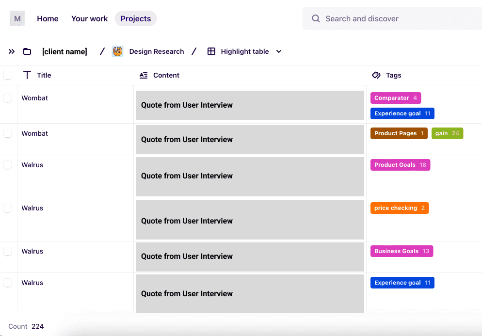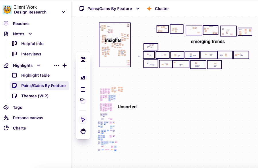 Highlight Canvas from the Dovetail research tool that shows trends and insights